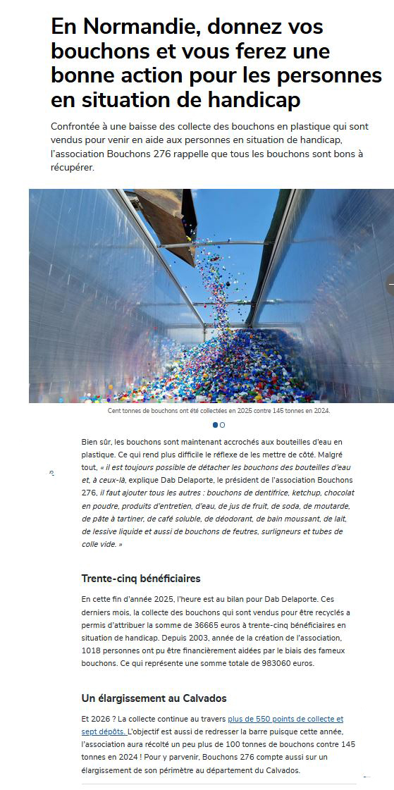 BOUCHONS 276 finance des aides au profit de personnes en situation de #handicap par la collecte de TOUS les #bouchons et #couvercles en #plastique en #Normandie